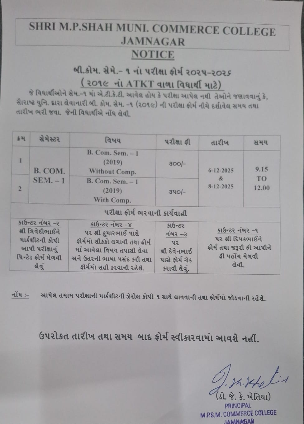 Following is notice regarding university examination form filling for B. Com. Sem 1 (2019) ATKT students